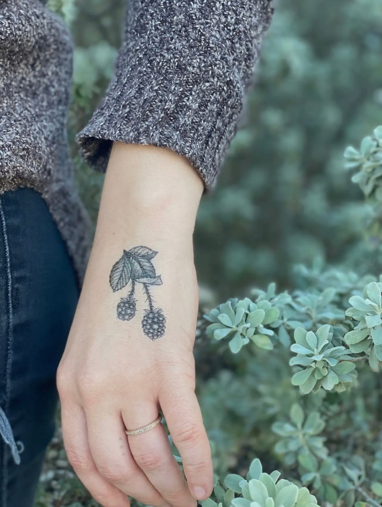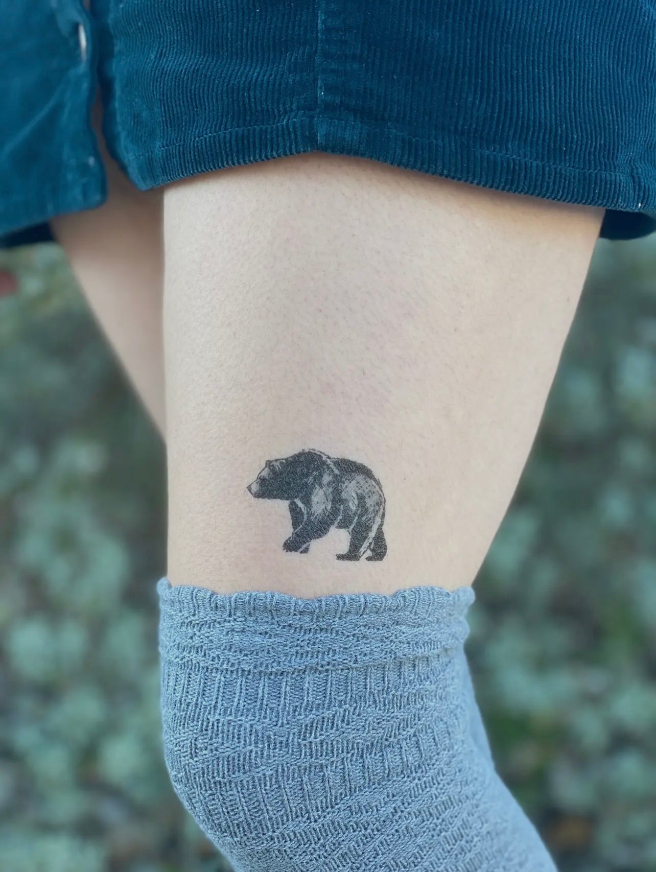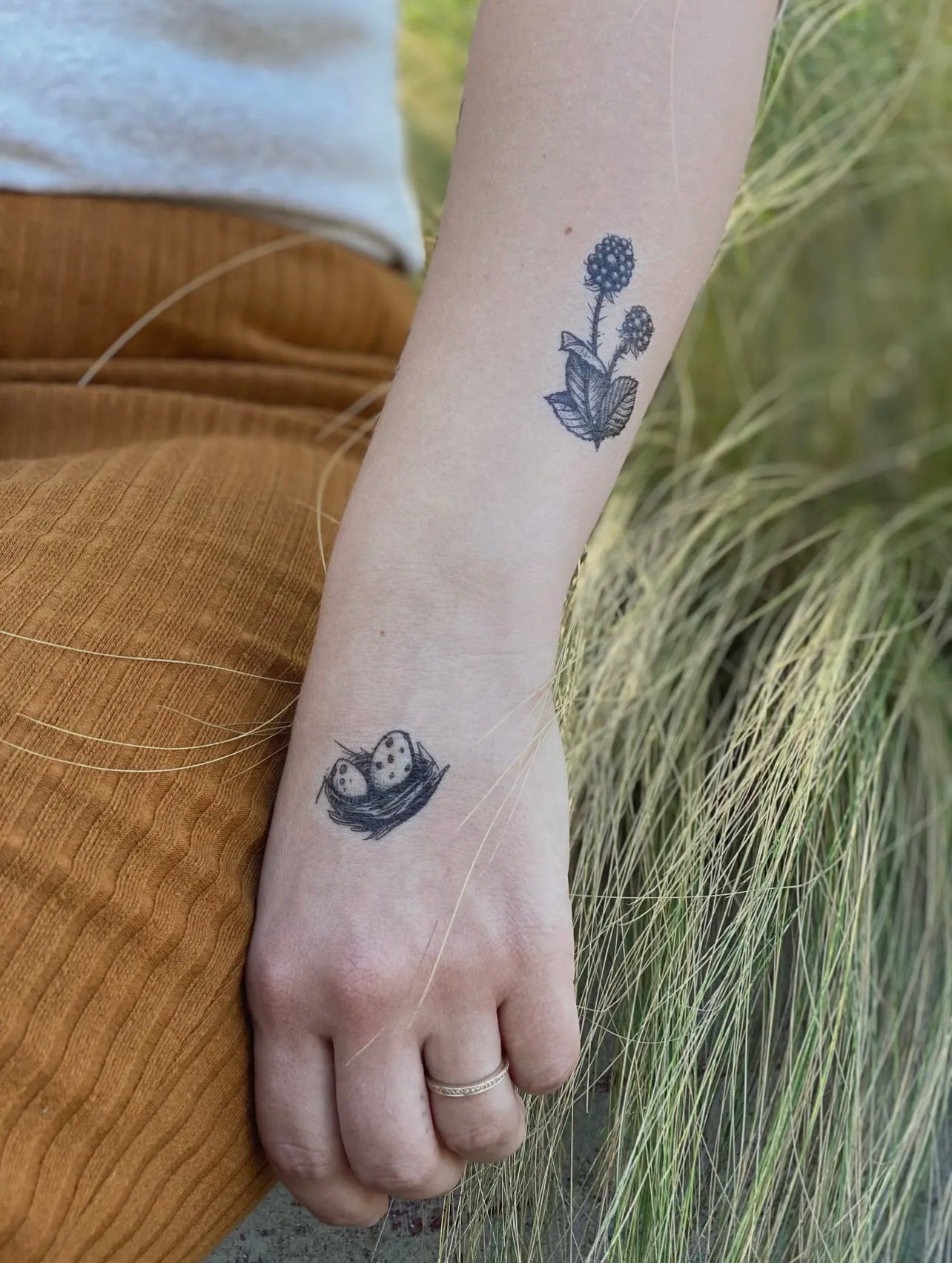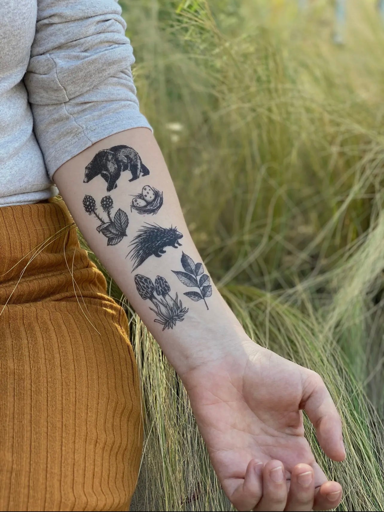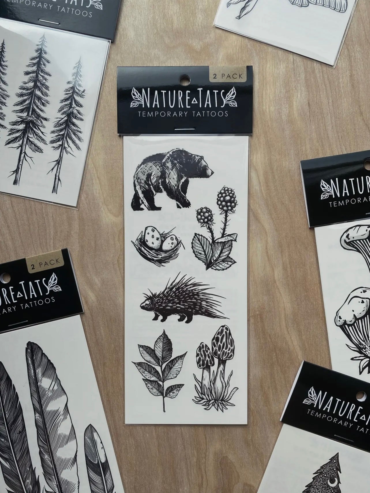 Forest Forage temporary tattoo. Peacefully roaming and foraging, this bear and porcupine explore the forest for snacks. Also featured in the collection are wild blackberries, spotted eggs in a nest, morel mushrooms, and a fallen ash leaf. The sheet is 3" by 7".